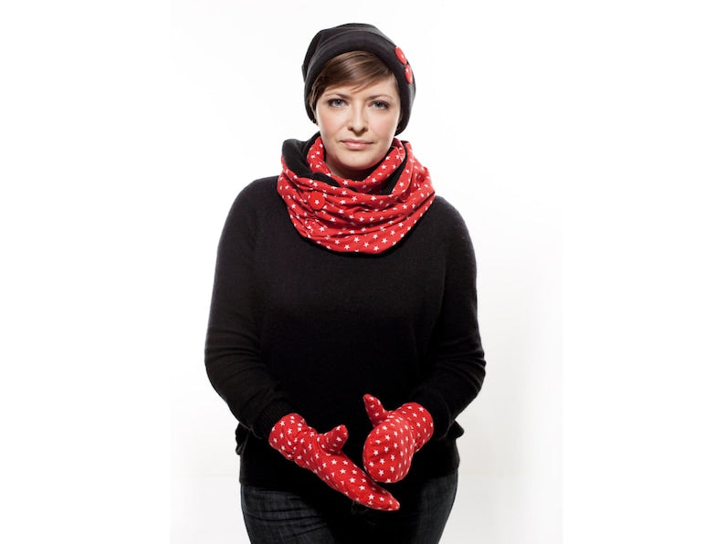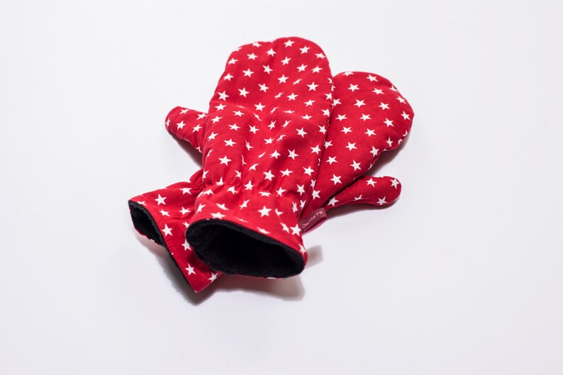 Die Handschuhe sind außen aus einem roten, mit weißen Sternen bedruckten, Baumwollstoff. Innen sind sie aus schwarzem Polarfleece. Damit es vom Arm her nicht rein zieht haben sie ein Gummi am Handgelenk.