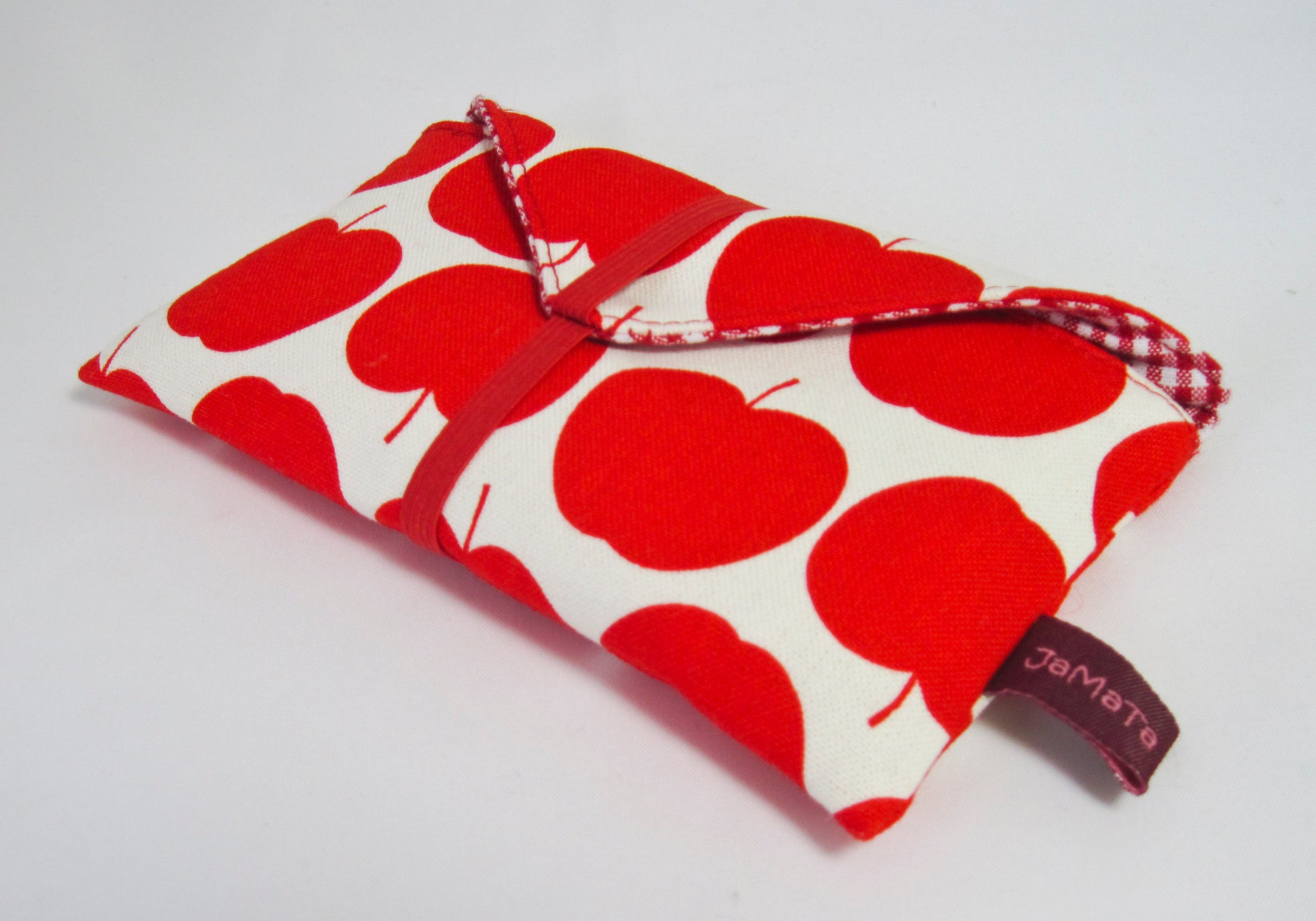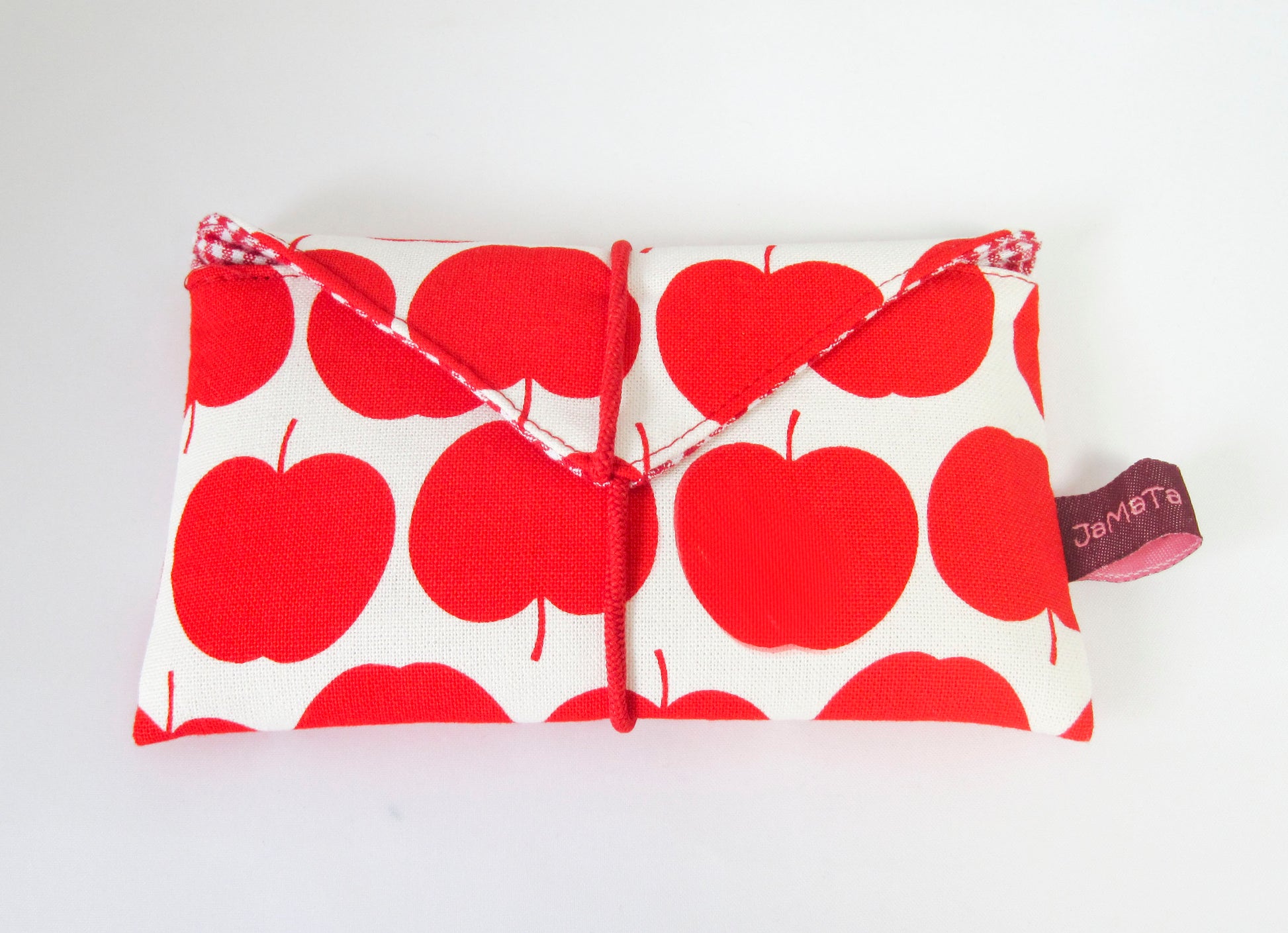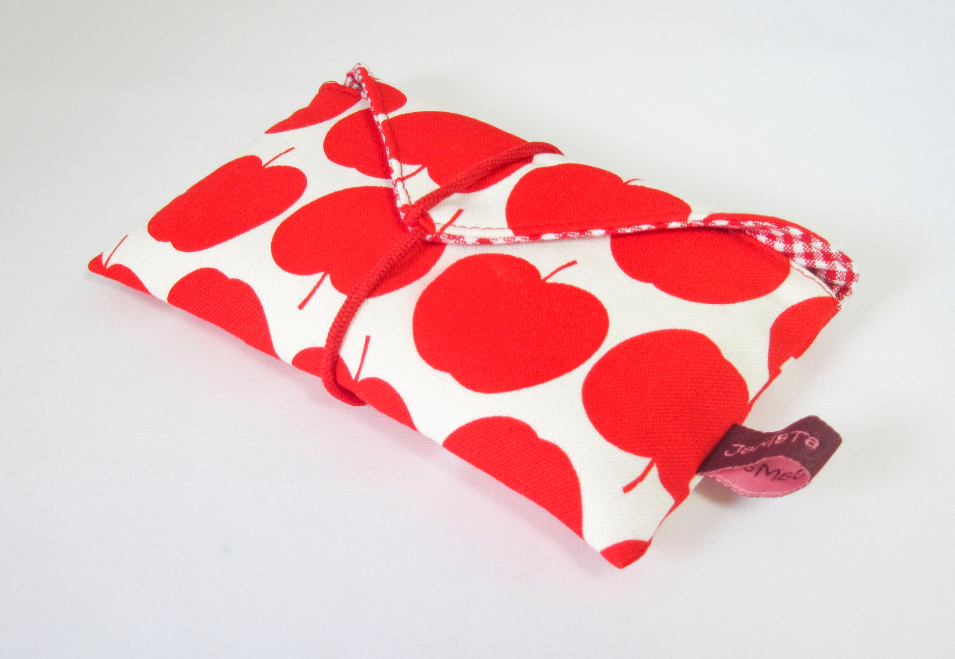 Außen ist die Tasche aus einem cremeweißen Stoff, der mit Äpfeln in petrol oder rot bedruckt ist. Gefüttert ist sie mit rot/weißem Vichykaro. Beide Stoffe sind aus reiner Baumwolle.