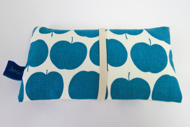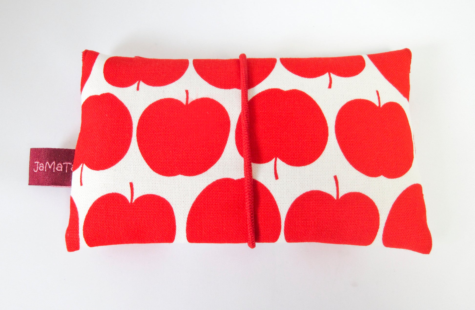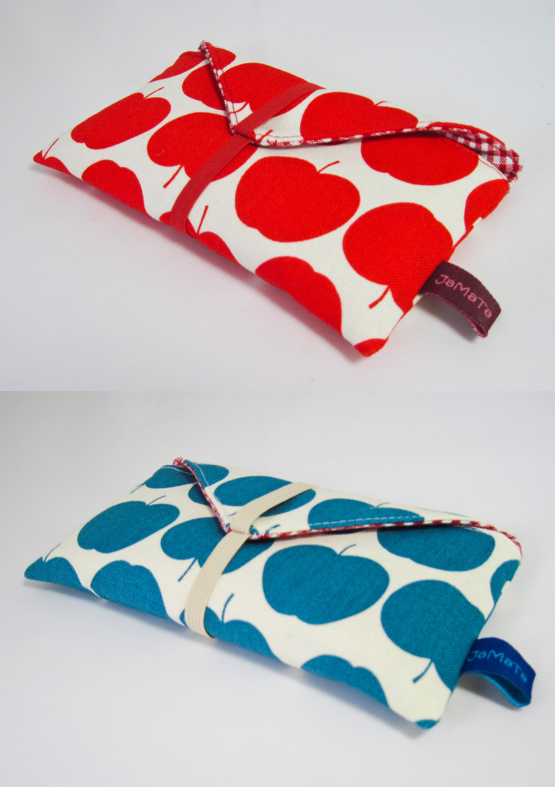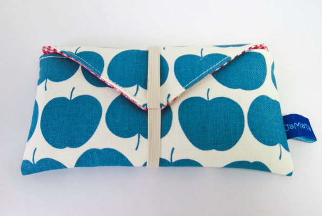 Außen ist die Tasche aus einem cremeweißen Stoff, der mit Äpfeln in petrol oder rot bedruckt ist. Gefüttert ist sie mit rot/weißem Vichykaro. Beide Stoffe sind aus reiner Baumwolle.