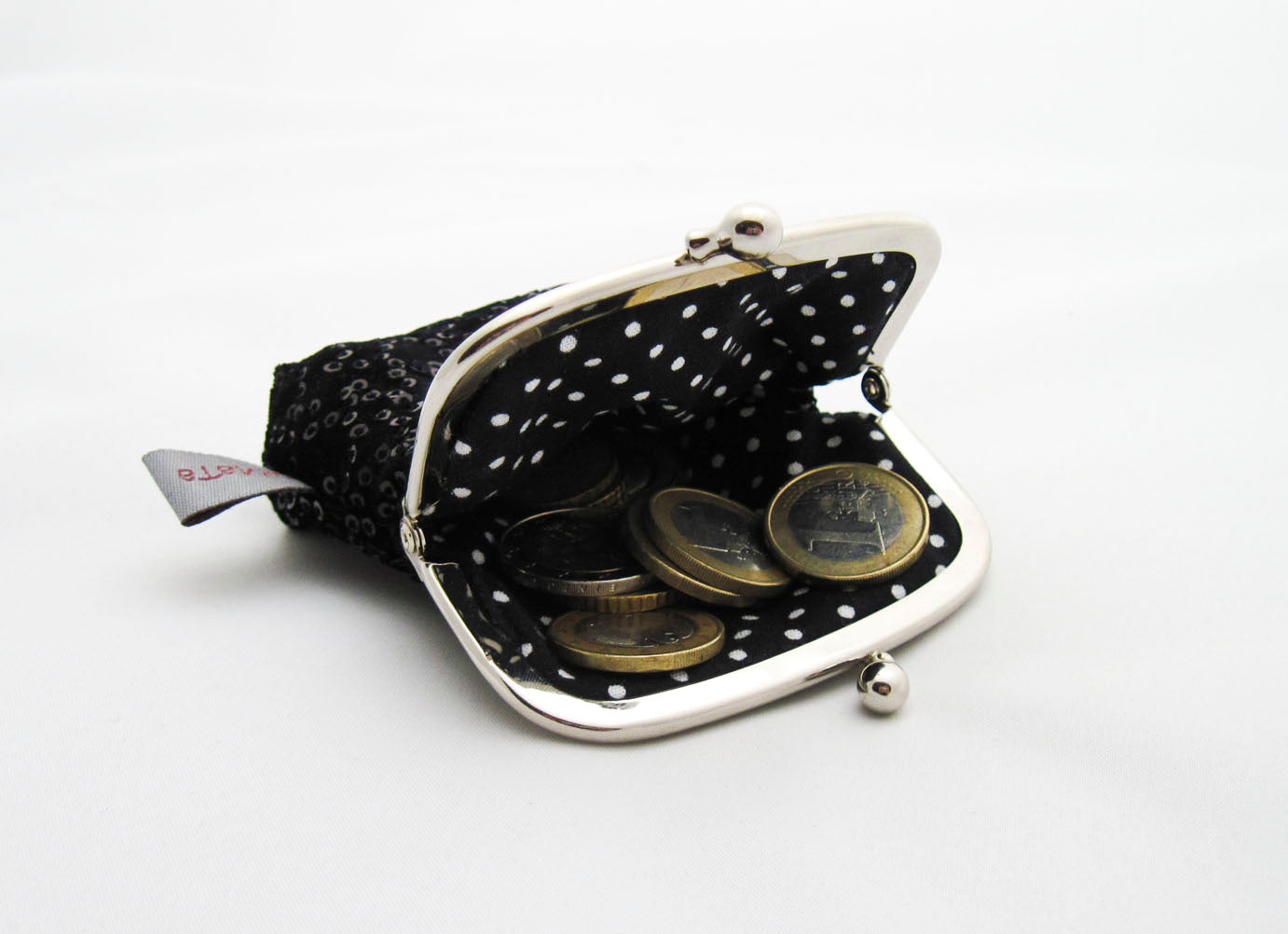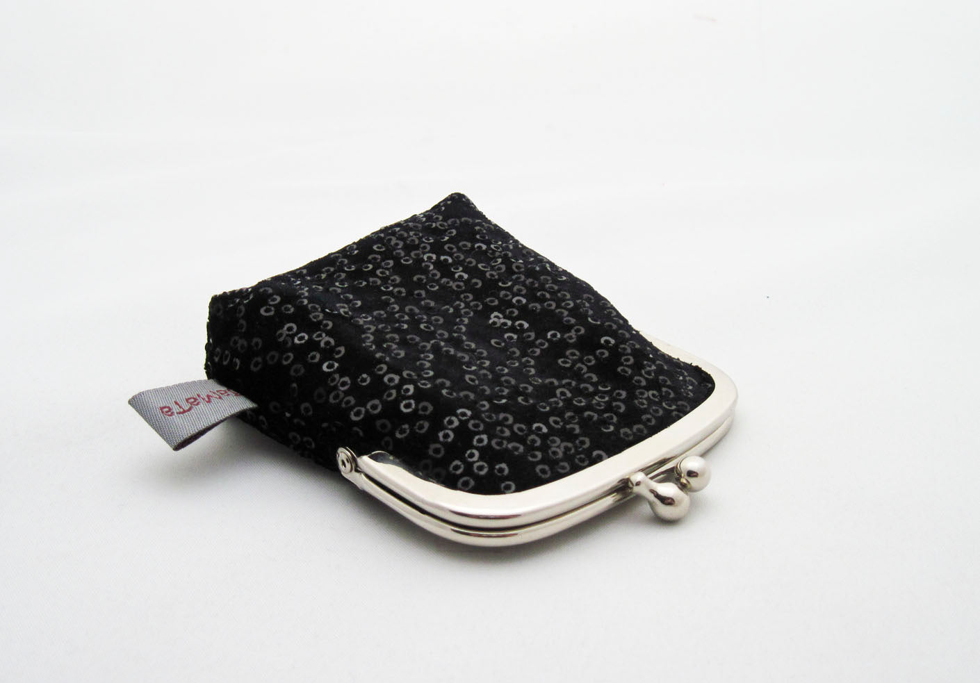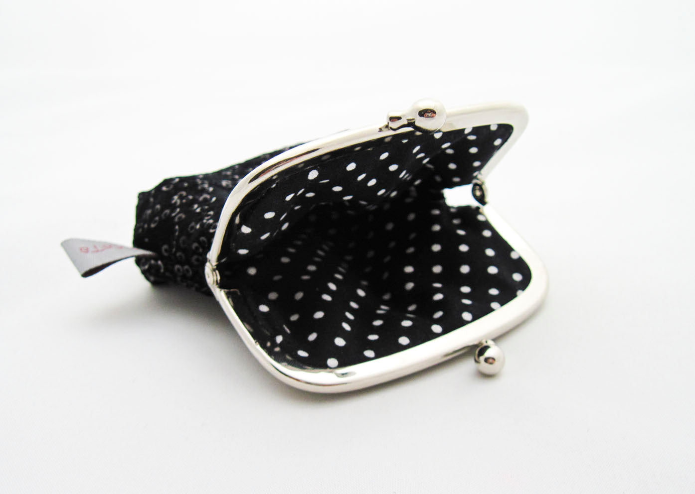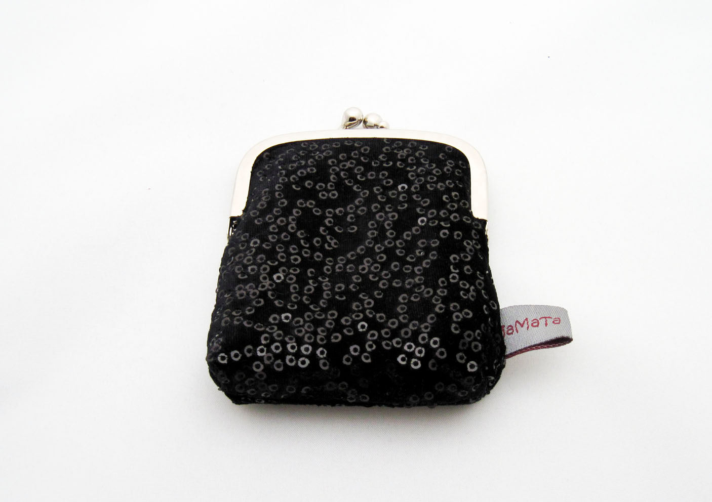 Außen ist das Portemonnaie aus Mesh mit schwarzem Pailletten. Innen ist es aus einem schwarzem Stoff mit weißen Pünktchen. Das Etui ist beidseitig wattiert und hat einen angeschnittenen Boden, so dass es zusätzliches Volumen erhält.
