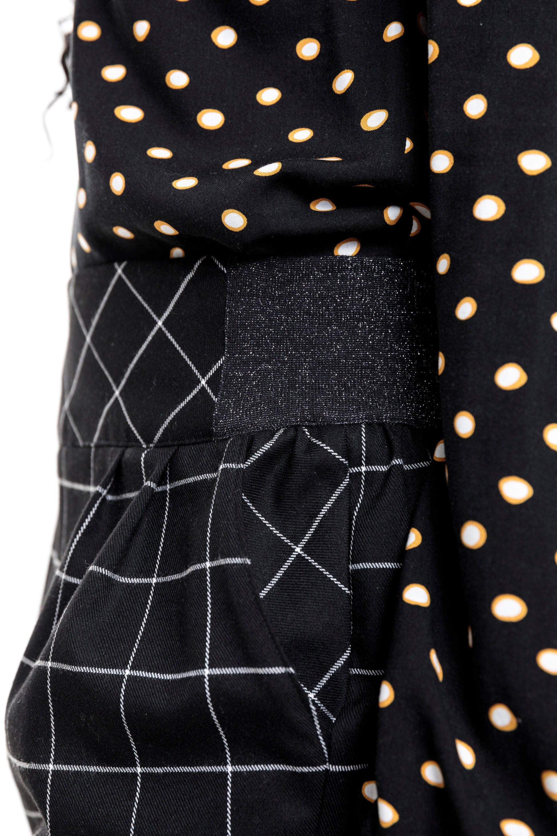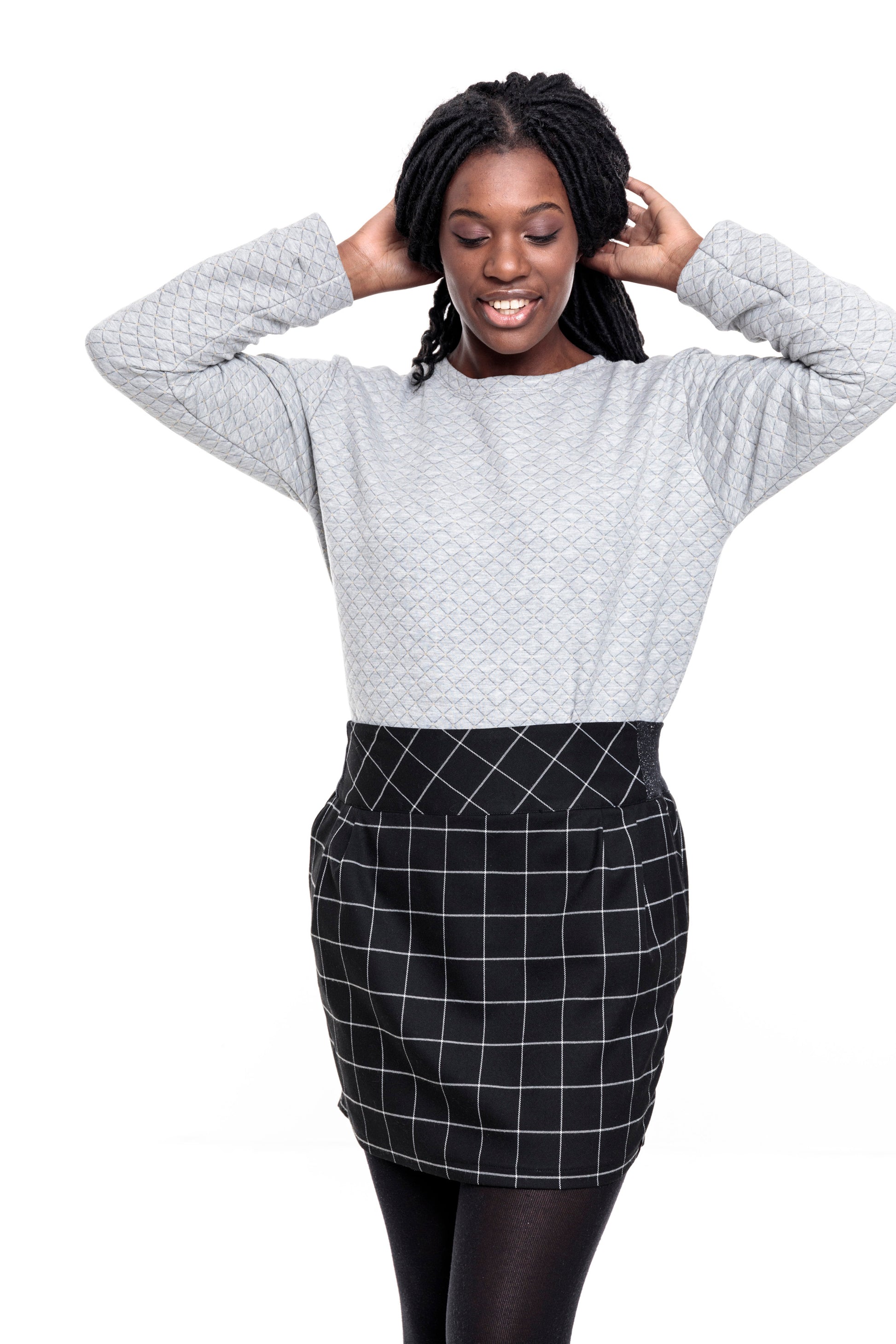 Das Karo ist im Rock gerade zugeschnitten und an der Passe und den Taschen schräg, was ihn zusätzlich interssante macht.