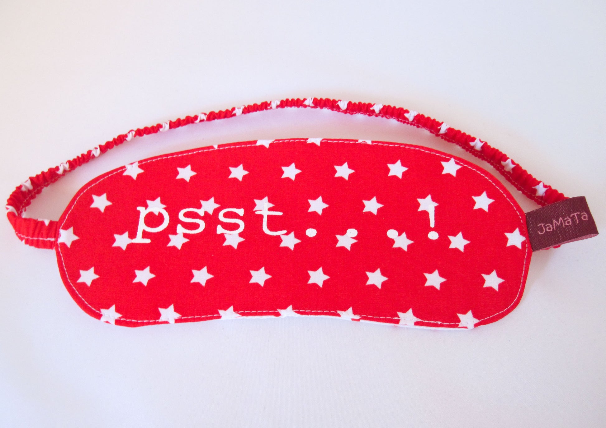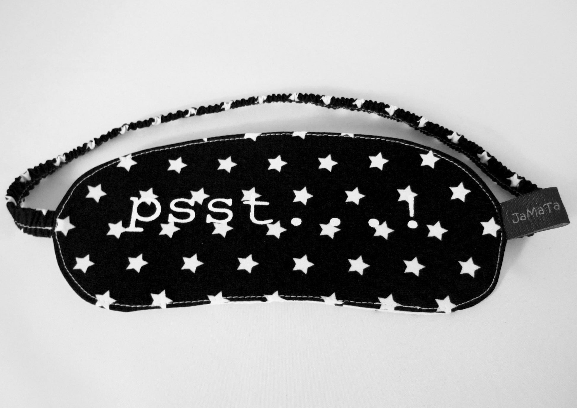 Auf einer Seite ist die Schlafbrille aus einem roten oder schwarzen Stoff mit weißen Sternen und "psst...!" Schriftzug und auf der anderen Seite aus einem weißen Stoff mit roten oder schwarzen Pünktchen. Sie kann beidseitig getragen werden. Verstärkt wird sie auf einer seite mit Klebewatte und auf der anderen Seite mit Gewebeeinlage, was sie einerseits schön weich, aber auch fest macht, so dass nichts verrutschen kann.
